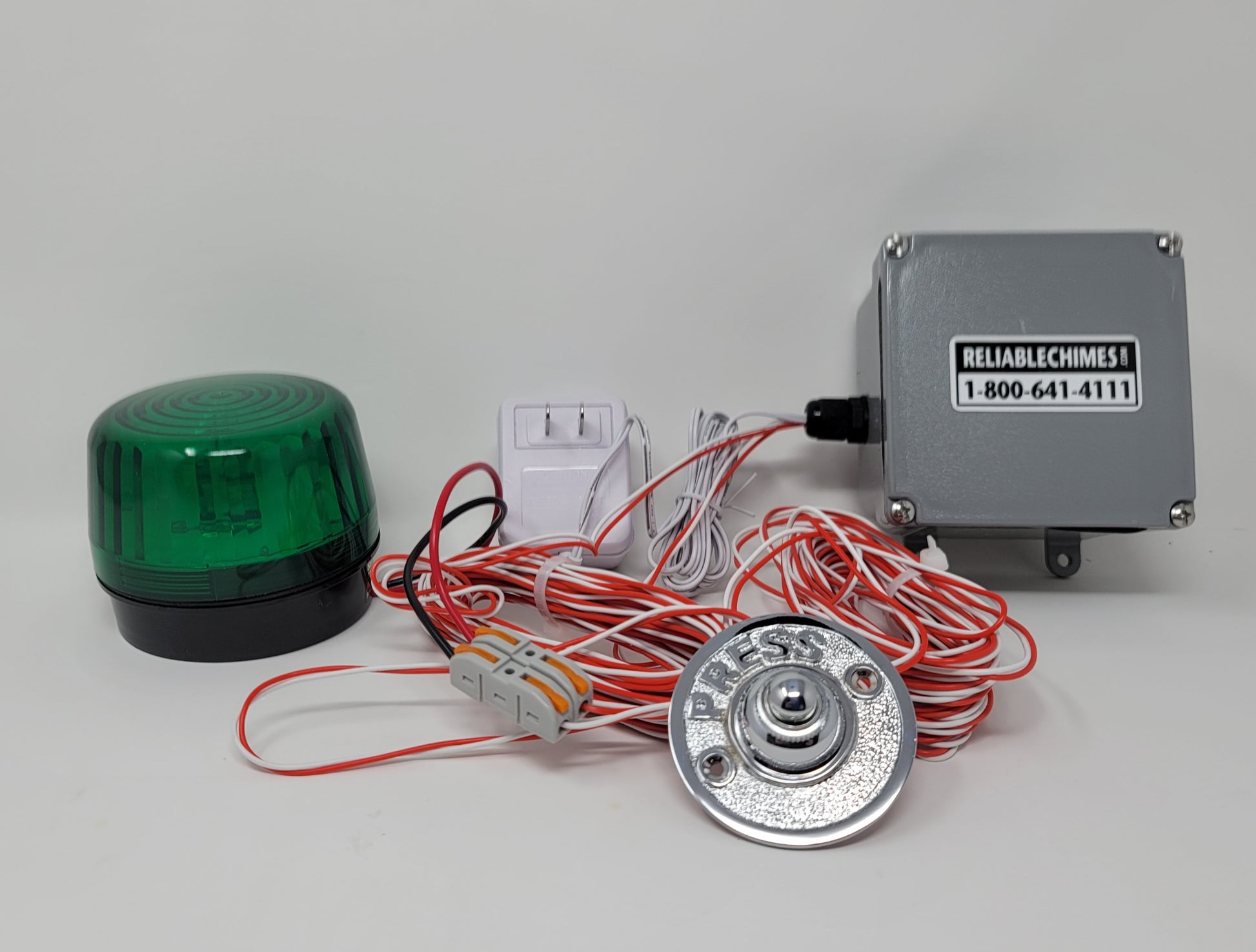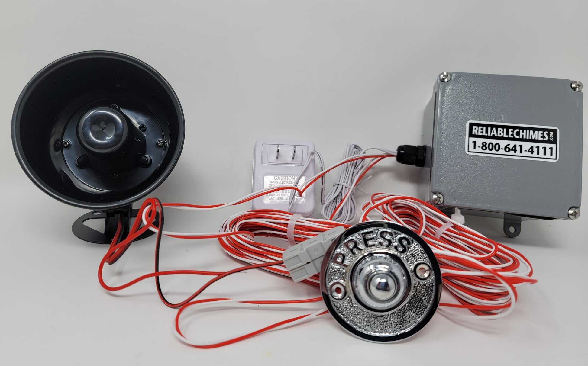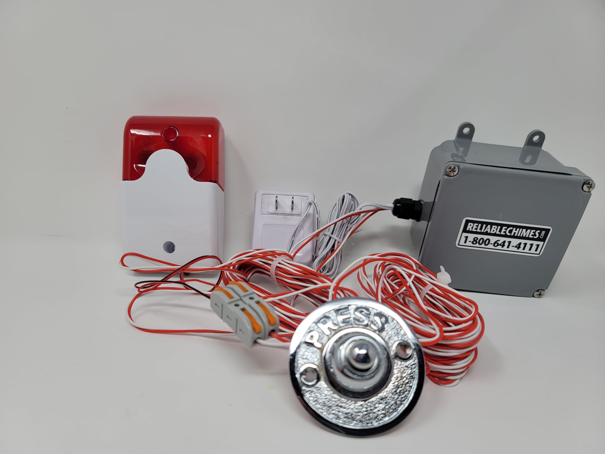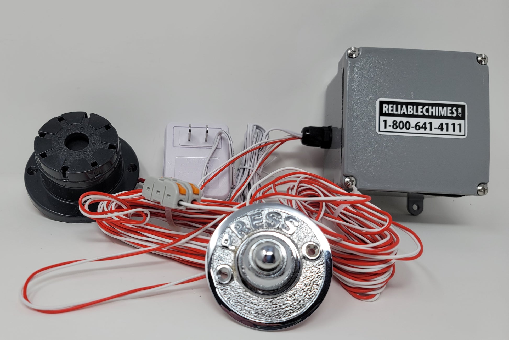 With our warehouse door bells, you'll hear it no matter where you are or what's going on inside of the warehouse. For starters, we have our wired doorbell. This doorbell has become one of our most popular sellers because it works how it should every time, and at a very affordable price. It comes out of the box with a 12-volt transformer and doubles up with a 12 volt push button.