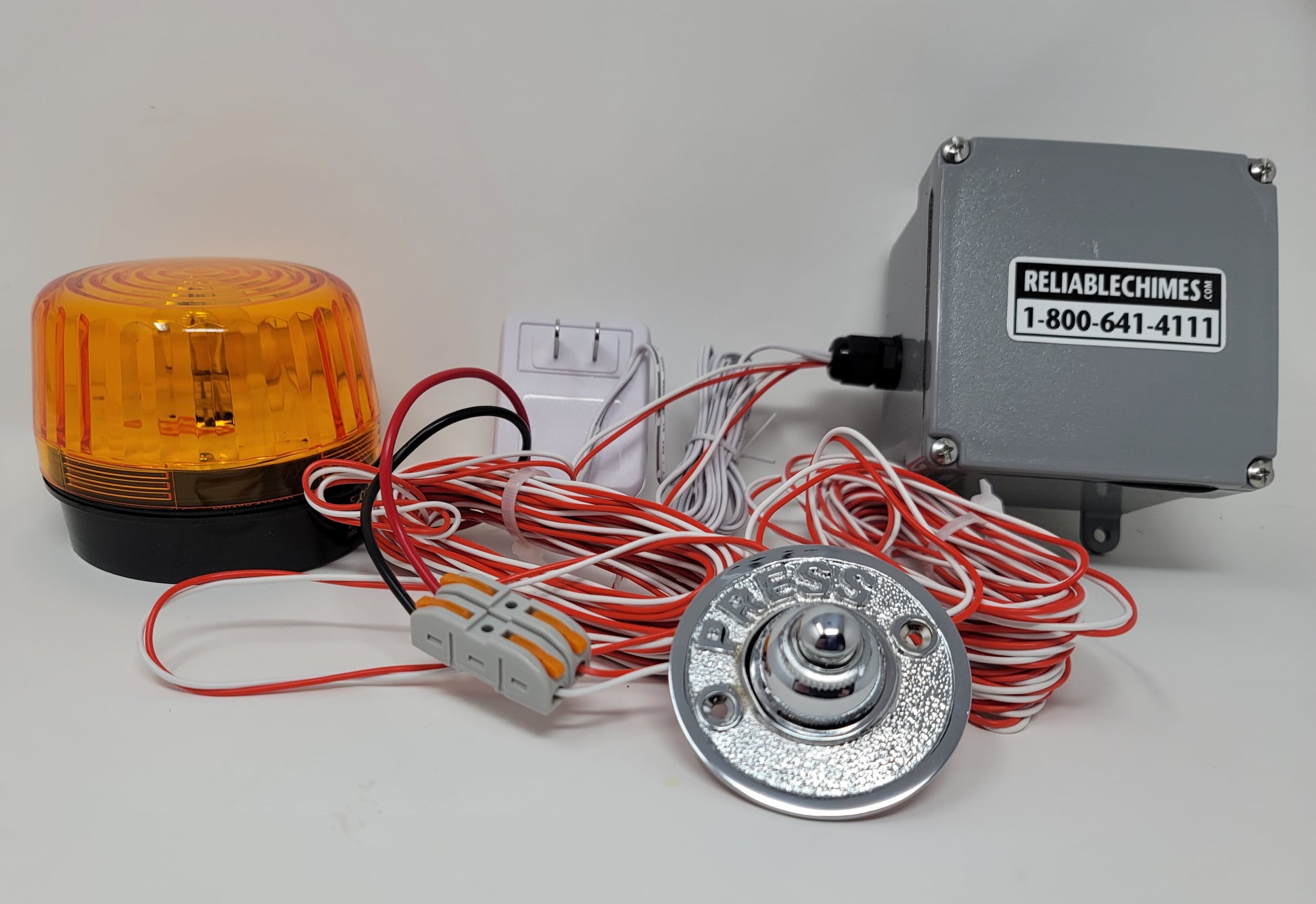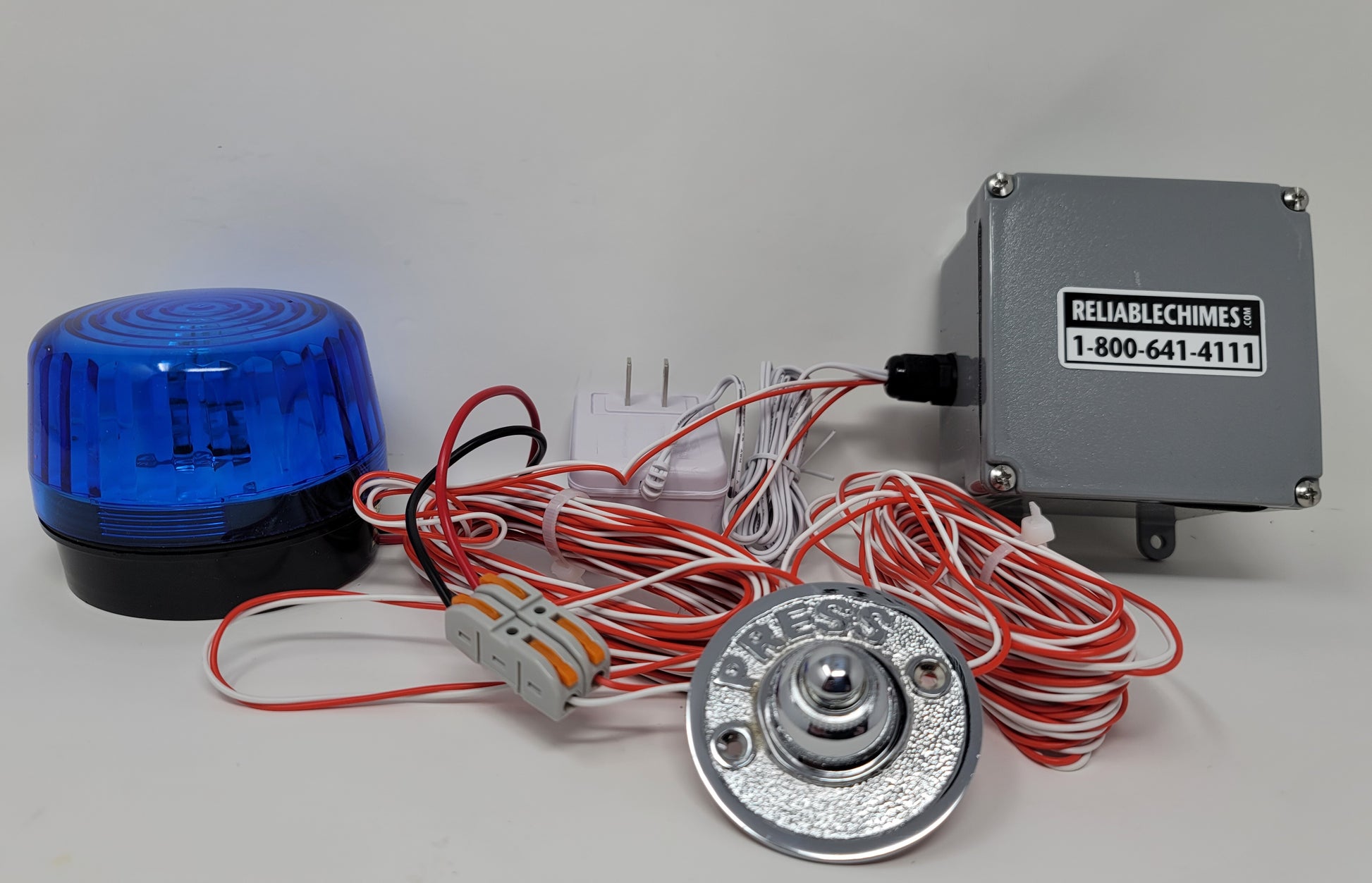 Or if you wish to have a hybrid system ( heavy duty wired button to a wireless transmitter transmitting to a wireless receiver), we can do that as well. Please call 8006414111